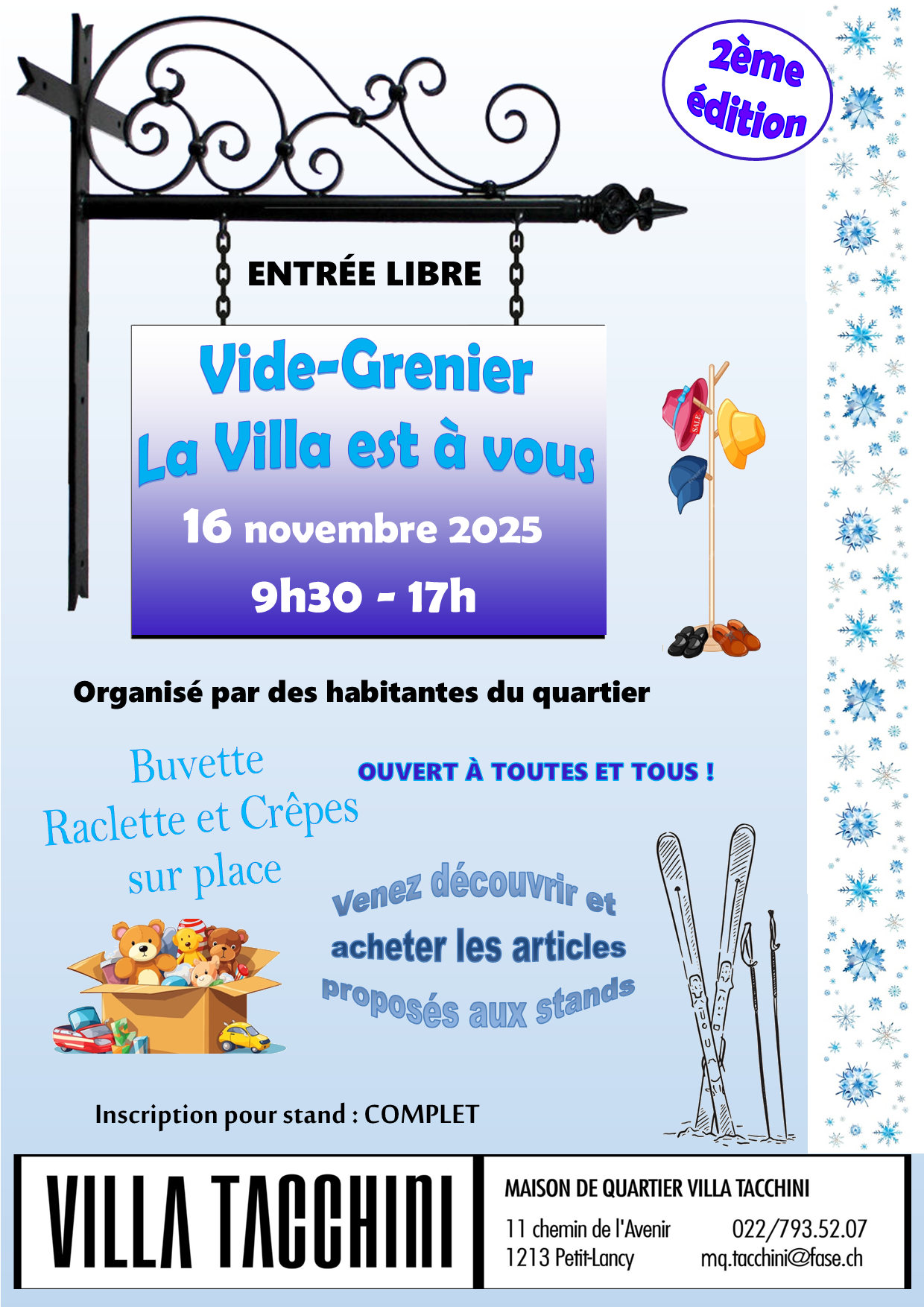 Le dimanche 16 novembre 2025, de 09h30 à 17h, la Villa Tacchini accueillera un vide-grenier ouvert à tous les habitants du quartier et aux visiteurs curieux ! Organisé par des habitantes du quartier en collaboration avec la Villa Tacchini, cet événement convivial est l’occasion parfaite pour dénicher des trésors et passer un moment agréable en famille ou entre amis.